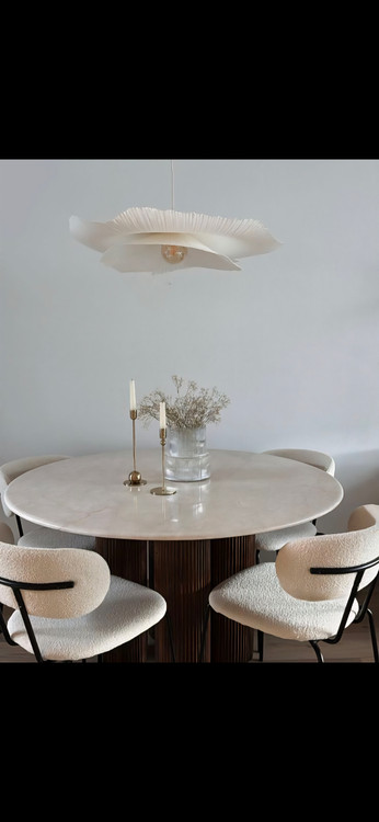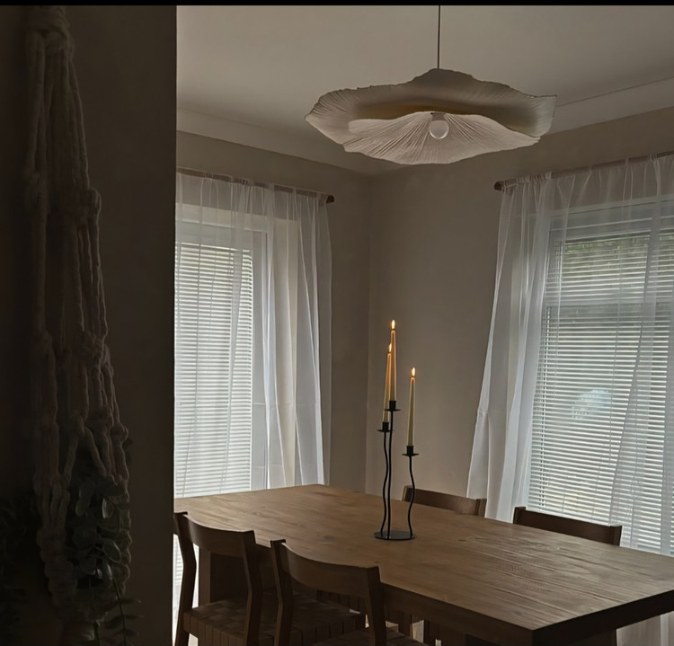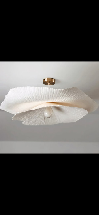 لوستر گل طرح زارا سفید از فروشگاه عسلی ارت. قطر۵۵ سانت . دو گل برگ . رنگ سفید شیری. اویز و سرپیچ سفید ، ارتفاع سیم ۷۰تا ۹۰سانت. متریال: پاپیه ماشه بسیار سبک