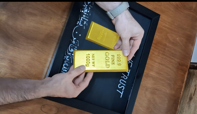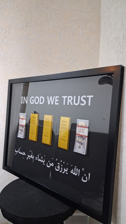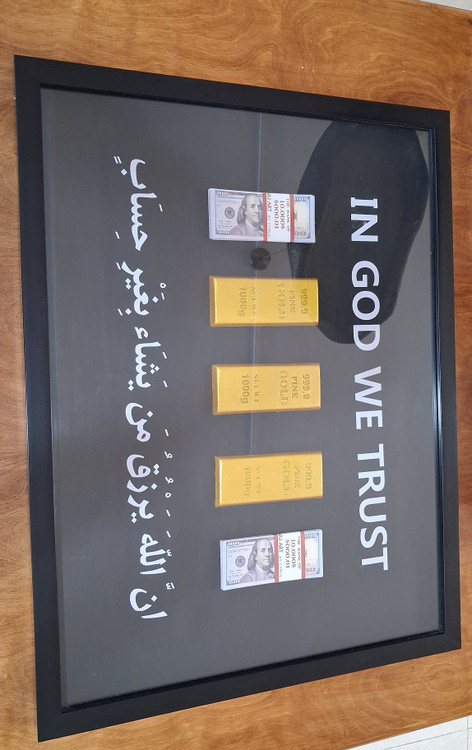 تابلودسته دلار و شمش، ان الله یرزق.. سفارش تابلو دیواری اسکناس و شمش از عسل ارت در ابعاد ۸۰×۶۰✅️رنگ مشکی✅️ جنس قاب : فايبر گلاس✅️قطر تابلو ۳سانت✅️روى تابلو شيشه سه میلی به كار رفته است✅ از دسته اسكناس های۱۰۰ دلاری جدید تولید شده✅️قطرشمش ها ۱سانت✅️فوق العاده باکیفیت و لاکچری👌