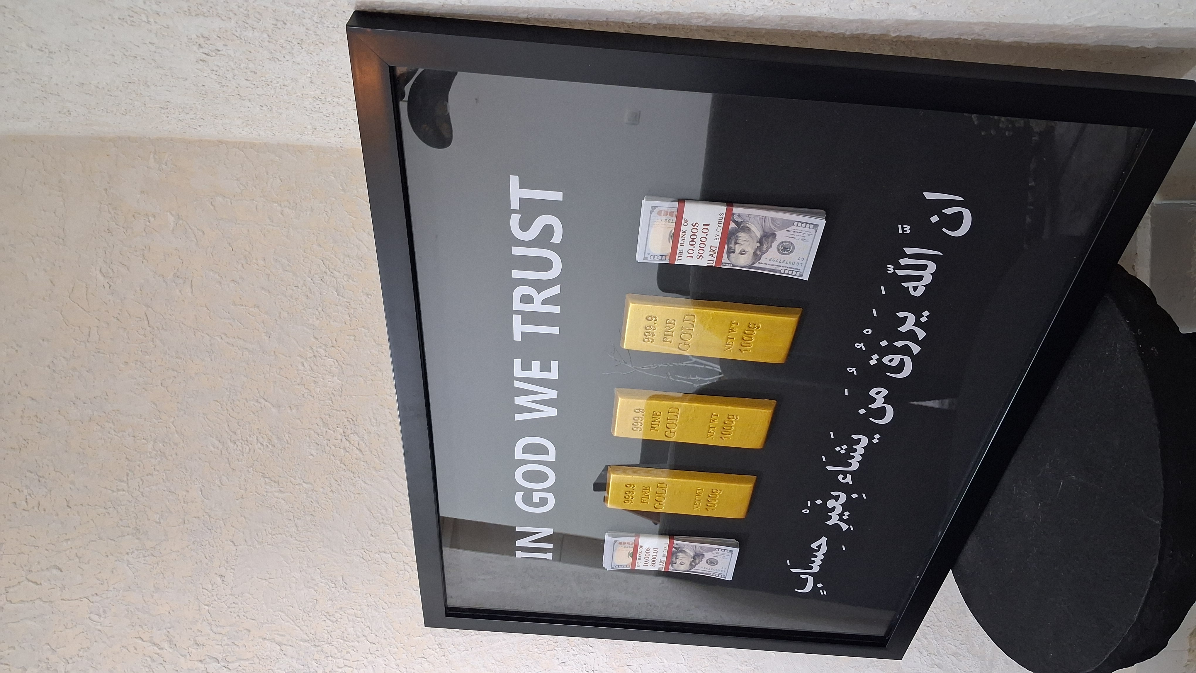 تابلودسته دلار و شمش، ان الله یرزق.. سفارش تابلو دیواری اسکناس و شمش از عسل ارت در ابعاد ۸۰×۶۰✅️رنگ مشکی✅️ جنس قاب : فايبر گلاس✅️قطر تابلو ۳سانت✅️روى تابلو شيشه سه میلی به كار رفته است✅ از دسته اسكناس های۱۰۰ دلاری جدید تولید شده✅️قطرشمش ها ۱سانت✅️فوق العاده باکیفیت و لاکچری👌